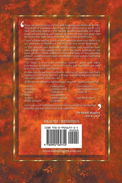 Since my first printing of Fruit and Vegetables as Medicine literally thousands of consumers have used the information to assist with their wellbeing recovery. The healing benefits associated with these foods are astounding and impress people with just how good they feel when they start using Fruit and Vegetables as Medicines. There is more healing in a fruit and vegetable store than there is in any pharmacy or dispensary, including my own herbal dispensary. In this updated and expanded edition juices and smoothies have been added. Often people try to put in too many products or too much of certain foods which overwhelm the body. In this expanded edition smoothies and juices are offered to treat general wellbeing recovery issues. This book is your total wellbeing recovery guide and offers information to educate why certain fruits and vegetables are used and what nutrients they house. Broken into six sections this book is very easy to negotiate and find a solution to wellbeing recovery and easy to understand explanations why each product works so well. Solutions are offered to address most common conditions such as: Arthritis, Abscesses, Asthma, Boils, Anxiety, Blood pressure, Constipation, Irritable bowel, Cholesterol management, Chronic fatigue, syndrome, Convalescence, Cortisone treatment, Dandruff and many more. Gain a sense of wellbeing recovery and be excited by the healing potential that lies within fruit and vegetables.