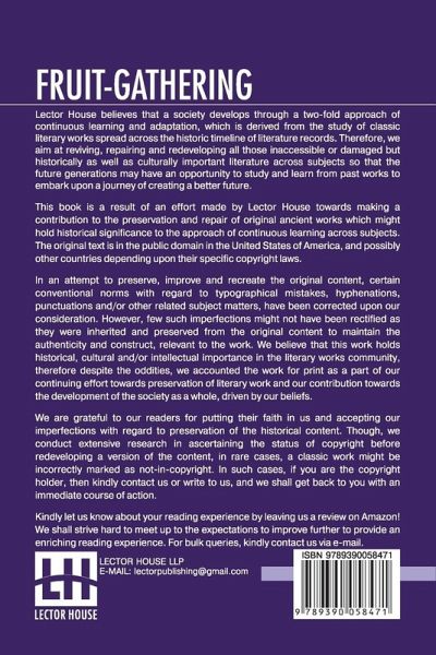 Fruit-Gathering: Translated From Bengali To English By The Author This book is a result of an effort made by us towards making a contribution to the preservation and repair of original classic literature. In an attempt to preserve, improve and recreate the original content, we have worked towards: 1. Type-setting & Reformatting: The complete work has been re-designed via professional layout, formatting and type-setting tools to re-create the same edition with rich typography, graphics, high quality images, and table elements, giving our readers the feel of holding a 'fresh and newly' reprinted and/or revised edition, as opposed to other scanned & printed (Optical Character Recognition - OCR) reproductions. 2. Correction of imperfections: As the work was re-created from the scratch, therefore, it was vetted to rectify certain conventional norms with regard to typographical mistakes, hyphenations, punctuations, blurred images, missing content/pages, and/or other related subject matters, upon our consideration. Every attempt was made to rectify the imperfections related to omitted constructs in the original edition via other references. However, a few of such imperfections which could not be rectified due to intentional\unintentional omission of content in the original edition, were inherited and preserved from the original work to maintain the authenticity and construct, relevant to the work. We believe that this work holds historical, cultural and/or intellectual importance in the literary works community, therefore despite the oddities, we accounted the work for print as a part of our continuing effort towards preservation of literary work and our contribution towards the development of the society as a whole, driven by our beliefs. We are grateful to our readers for putting their faith in us and accepting our imperfections with regard to preservation of the historical content. HAPPY READING!