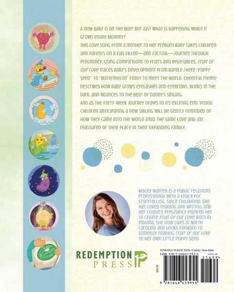 A new baby is on the way! But just what is happening while it grows inside Mommy? This love song from a mother to her preborn baby takes children and parents on a fun-filled-and factual-journey through pregnancy. Using comparisons to fruits and vegetables, Fruit of Our Love traces baby's development from barely-there "poppy seed" to "watermelon" ready to meet the world. Cheerful rhyme describes how baby grows eyelashes and eyebrows, blinks in the dark, and bounces to the beat of Daddy's singing. And as the forty-week journey draws to its exciting end, young children anticipating a new sibling will be gently reminded of how they came into the world amid the same love and joy, reassured of their place in their expanding family.