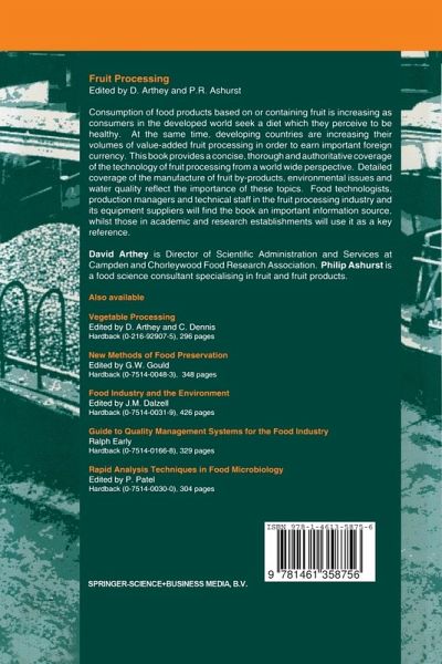 1. Introduction to fruit processing.- 1.1 Processing on a global scale.- 1.2 Factors influencing processing.- 1.3 Fruit types for processing.- 1.4 Controlling factors in the ripening of fruit.- 1.5 Biosynthesis of flavours.- 1.6 Factors influencing fruit quality and crop yield.- 1.7 Flavour characteristics.- 1.8 The global market: threats and opportunities.- 1.9 Fruit processing.- 2. Fruit and human nutrition.- 2.1 Introduction.- 2.2 Composition of fruits.- 2.3 The importance of fruit in the human diet.- 2.4 Changes in nutritive value during processing.- 3. Storage, ripening and handling of fruit.- 3.1 Maturing and ripening.- 3.2 Temperature and respiration.- 3.3 Storage atmospheres.- 3.4 Maintaining quality.- 4. Production of non-fermented fruit products.- 4.1 Introduction.- 4.2 Fruit quality.- 4.3 Temperate fruit juices.- 4.4 Tropical fruit juices.- 4.5 Clarification of fruit juices.- 4.6 Methods of preservation.- 4.7 Concentration of fruit juice.- 4.8 Products derived from fruit juice.- 4.9 Adulteration of fruit juice.- 5. Cider, perry, fruit wines and other alcoholic fruit beverages.- 5.1 Introduction.- 5.2 Cider.- 5.3 Perry (poire).- 5.4 Fruit wines.- 5.5 Fruit spirits and liqueurs.- 5.6 Miscellany.- 6. Production of thermally processed and frozen fruit.- 6.1 Introduction.- 6.2 Raw materials.- 6.3 Canning of fruit.- 6.4 Varities of fruit.- 6.5 Bottling.- 6.6 Freezing.- 6.7 Aseptic packaging.- 7. The manufacture of preserves, flavourings and dried fruits.- 7.1 Preserves.- 7.2 Fruits preserved by sugar: glacé fruits.- 7.3 Fruits preserved by drying.- 7.4 Flavourings from fruits.- 7.5 Tomato purée.- 8. The by-products of fruit processing.- 8.1 Introduction.- 8.2 By-products of the citrus industry.- 8.3 Natural colour extraction from fruit waste.- 8.4 Apple waste treatment.- 8.5 Production of pectin.- 9. Water supplies, effluent disposal and other environmental considerations.- 9.1 Introduction.- 9.2 Water sourcing.- 9.3 Primary treatment.- 9.4 Secondary treatment.- 9.5 Effluent planning.- 9.6 Effluent characterization.- 9.7 Effluent treatment.- 9.8 Forms of biological treatment.- 9.9 Tertiary treatment.- 9.10 Environmental auditing.