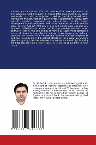 An investigation entitled "Effect of chemicals with climatic parameters on fruit retention, yield and quality of mango (Mangifera indica L.) cv. Kesar" was carried out with an objective to reduce fruit drop as well as to improve the fruit set, yield and quality by foliar application of various plant growth regulators, polyamines and micronutrients. In the present investigation Naphthalene Acetic Acid (NAA) 25 ppm at full bloom and pea stage, Salicylic Acid (SA) 100 ppm at pea and marble stage and also Zinc Sulphate (ZnSO4) 0.5% at pea and marble stage gave best results in respect to fruit retention, yield and quality of mango cv. Kesar. While correlation studies of climatic factors indicated that high or low temperature had non-significant correlations with fruit set and retention but high temperature and low humidity showed beneficial effects on the physical parameters, yield and quality attributes whereas, low temperature and high humidity exhibited less beneficial or deleterious effects on the above traits in Kesar mango.