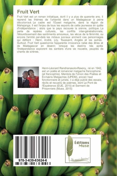 Fruit Vert est un roman initiatique, écrit il y a plus de quarante ans. Il reprend les thèmes de l'urbanité dans un Madagascar à peine décolonisé. Le cadre est l'Ouest malgache, dans la région de Mahajanga. Il est l'enjeu de tous les espoirs de cette jeunesse en quête d'indépendance ; alors que le pays recouvre la sienne, politique. La perte de repères culturels, les conflits inter-générationnels, l'étourdissement des sentiments amoureux, les vécus de la féminité, ou encore l'amitié par-delà les milieux sociaux animent ces personnages qui défilent : Henri, André, Lily, Toussaint, Angèle et les autres. Surtout, Fruit Vert questionne l'apparente innocence naïve des êtres et de Madagascar en devenir, lorsque les destins nés après l'Indépendance explorent les sentiers d'une vie nouvelle, peuplés de chants de sirènes.