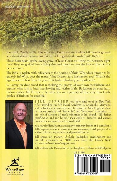 Jesus said, "Verily, verily, I say unto you, Except a corn of wheat fall into the ground and die, it abideth alone: but if it die, it bringeth forth much fruit!" (KJV) Those born again by the saving grace of Jesus Christ are living their eternity right now! They are grafted into a living vine and meant to bear the fruit of their Savior here and now. The Bible is replete with references to the bearing of fruit. What does it mean to be grafted- in? What does the master Vine Dresser have in store for you? What is the significance of first fruits? Is your fruit fresh, refreshing, and authentic? Cut away the dead wood that is choking the growth of your own fruitfulness, and explore what it is to bear free-flowing and fearless fruit. Be known by your fruit. Follow author Bill Girrier as he takes you on a journey of discovery into God's garden of fruition for your life.
