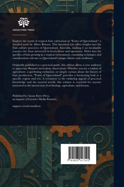 Explore the world of tropical fruit cultivation in "Fruits of Queensland," a detailed study by Albert Benson. This historical text offers insights into the fruit-culture practices of Queensland, Australia, making it an invaluable resource for those interested in horticulture and agronomy. Delve into the specifics of fruit growing in a tropical environment, examining techniques and considerations relevant to Queensland's unique climate and conditions. Originally published as a practical guide, this edition allows a new audience to appreciate Benson's meticulous observations. Whether you are a student of agriculture, a gardening enthusiast, or simply curious about the history of fruit production, "Fruits of Queensland" provides a fascinating look at a specific region and era. A testament to the enduring appeal of practical knowledge and the natural world, this volume is essential for anyone interested in the intersection of technology, agriculture, and botany. This work has been selected by scholars as being culturally important, and is part of the knowledge base of civilization as we know it. This work is in the public domain in the United States of America, and possibly other nations. Within the United States, you may freely copy and distribute this work, as no entity (individual or corporate) has a copyright on the body of the work. Scholars believe, and we concur, that this work is important enough to be preserved, reproduced, and made generally available to the public. We appreciate your support of the preservation process, and thank you for being an important part of keeping this knowledge alive and relevant.
