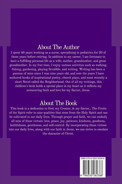 This book is a dedication to God, my Creator, & my Savior,. The Fruits of the Spirit refer to nine qualities that stem from the Holy Spirit and can be cultivated in our daily lives. Through prayer and faith, we can embody all nine of these virtues: love, peace, joy, patience, kindness, goodness, faithfulness, gentleness, and self-control. By incorporating these virtues into our daily lives, along with our faith in Jesus, we can strive to emulate the character of Christ.