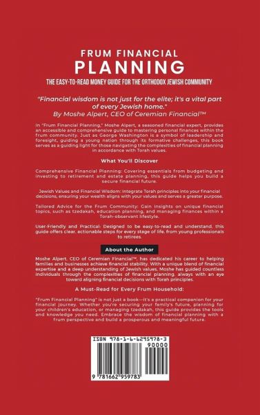 Navigating the financial complexities of the Jewish Orthodox community involves unique challenges. From private schooling to large families and expensive holidays, the financial demands can be overwhelming. In Frum Financial Planning: The Easy-to-Read Money Guide for the Orthodox Jewish Community renowned financial planner and CEO of Ceremian Financial(TM), Moshe Alpert, CFP®, leverages over a decade of experience and thousands of consultations to provide clear, actionable advice tailored to the specific needs of the frum community. This essential guide breaks down the fundamentals of creating a robust financial plan, offering practical strategies and insights. Readers will find this book to be educational, informative, and a valuable resource to achieving financial well-being. Discover comprehensive solutions to manage your finances effectively, ensuring stability and growth for your financial life.
