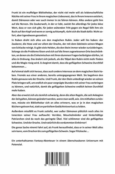 Ein unterhaltsames Fantasy-Abenteuer in einem überschaubaren Universum mit Potenzial: Magie, Chaos und jede Menge Spaß! Genug von langweiligen Helden und ewig gleichen Fantasy-Epen? Nein, natürlich nicht! Wieso auch? Aber etwas Abwechslung tut zwischendurch mal ganz gut, also tauche ein, werter Leser, in die wundersame Welt von Frunk, einem Bibliothekar mit magischem Liebesnest und partiellem Gedächtnisverlust. Frunk will nur eines: Ruhe und leidenschaftliche Nächte mit seiner Frau. Doch die Zauberwelt hat andere Pläne: Zwickende Magie, nervige Dämonen und ein Rubin, der alles verändert, machen ihm zu schaffen. - Dieser blöde Rubin, begehrt von Zauberern, Hexen und einem Drachen, der ihn zur Magenreinigung nutzt. Mehr oder weniger leidenschaftlich beschützt von Helden, die ihn ständig verlieren. Und dann wird auch noch seine Frau in die Sache mit hineingezogen, die schwertschwingende Frilde, die üblicherweise Dämonen in ihrem Inneren beherbergt. Die ganze Sache nimmt Fahrt auf, als Frunk herausfindet, dass er in seiner Welt alles sein kann, vom Drachen bis zum geflügelten Schwein. Sogar Flitzkacke ...Ein Fantasy-Spektakel voller skurriler Charaktere für Leser von Terry Pratchett, Walter Moers, Tom Holt, Jasper Fforde und Douglas Adams.