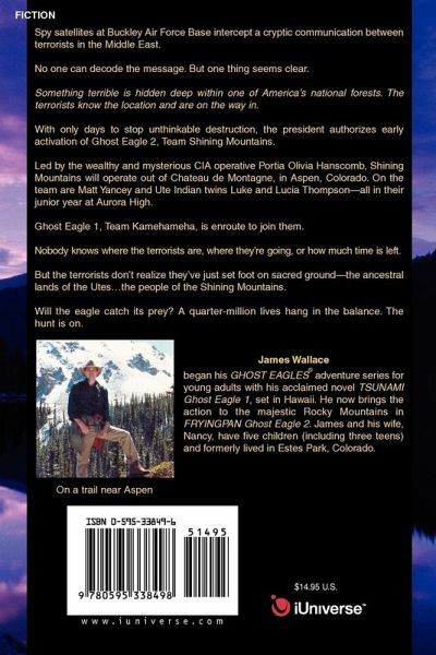 Spy satellites at Buckley Air Force Base intercept a cryptic communication between terrorists in the Middle East. No one can decode the message. But one thing seems clear. Something terrible is hidden deep within one of America's national forests. The terrorists know the location and are on the way in. With only days to stop unthinkable destruction, the president authorizes early activation of Ghost Eagle 2, Team Shining Mountains. Led by the wealthy and mysterious CIA operative Portia Olivia Hanscomb, Shining Mountains will operate out of Chateau de Montagne, in Aspen, Colorado. On the team are Matt Yancey and Ute Indian twins Luke and Lucia Thompson-all in their junior year at Aurora High. Ghost Eagle 1, Team Kamehameha, is enroute to join them. Nobody knows where the terrorists are, where they're going, or how much time is left. But the terrorists don't realize they've just set foot on sacred ground-the ancestral lands of the Utes.the people of the Shining Mountains. Will the eagle catch its prey? A quarter-million lives hang in the balance. The hunt is on.