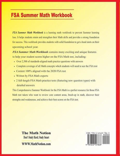 Prepare for The FSA Math Test with a Perfect Workbook! FSA Summer Math Workbook is a learning math workbook to prevent Summer learning loss. It helps students retain and strengthen their Math skills and provides a strong foundation for success. This workbook provides students with solid foundation to get a head starts on their upcoming school year. FSA Summer Math Workbook is designed by top test prep experts to help students prepare for the FSA Math test. It provides test-takers with an in-depth focus on the math section of the test, helping them master the essential math skills that test-takers find the most troublesome. This is a prestigious resource for those who need an extra practice to succeed on the FSA Math test in the summer. FSA Summer Math Workbook contains many exciting and unique features to help your student scores higher on the FSA Math test, including: * Over 2,500 of standards-aligned math practice questions with answers * Complete coverage of all Math concepts which students will need to ace the FSA test * Content 100% aligned with the latest FSA test * Written by FSA Math experts * 2 full-length FSA Math practice tests (featuring new question types) with detailed answers This Comprehensive Summer Workbook for the FSA Math is a perfect resource for those FSA Math test takers who want to review core content areas, brush-up in math, discover their strengths and weaknesses, and achieve their best scores on the FSA test. Published By: The Math Notion www.mathnotion.com