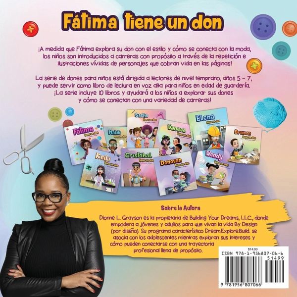 Español: ¡A medida que Fátima explora su don con el estilo y cómo se conecta con la moda, los niños son introducidos a carreras con propósito a través de la repetición e ilustraciones vívidas de personajes que cobran vida en las páginas! La serie de dones para niños está dirigida a lectores de nivel temprano, años 5 - 7, y puede servir como libro de lectura en voz alta para niños en edad de guardería. ¡La serie incluye 10 libros y ayudará a los niños a explorar sus dones y cómo se conectan con una variedad de carreras! English: As Fatima explores her gift with style and how it connects to fashion, children are introduced to purposeful careers with repetition, sight words, and vivid illustrations of characters who come to life on the pages! The Children's Gift Series targets early level readers, ages 5 - 7, and can serve as read-aloud books for daycare ages. The series features 10 books that will help children explore their gifts and how they connect with a variety of careers.