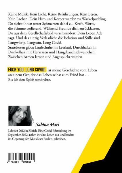 Balancierend zwischen tiefgründiger, literarisch dichter Reflexion, Nahbarkeit, sprachlicher Intensität und Momenten voller Leichtigkeit und Humor zeichnet Sabina Mari in ihrem Buchdebüt kraftvolle und eindringliche Bilder, die auch Außenstehenden ein nachhallendes Gefühl vermitteln, was es bedeutet, Long Covid oder ME/CFS zu haben. Als Appell an Empathie zeigt sie in ihrer eigenen sehr persönlichen Begegnung mit Schmerzen, Stille, Dunkelheit, Isolation und Verlusten auf allen Ebenen, welchen Hürden sich Erkrankte innerhalb einer nahezu unaufgeklärten Gesellschaft stellen müssen. Fernab von künstlicher Dramatisierung konfrontiert sie in diesem Zusammenhang - schonungslos, doch ohne anzuklagen - mit bestehenden sozialen Strukturen und regt dazu an, diese infrage zu stellen.Trotz oftmals fehlender Kraft demonstriert ihre Suche nach Genesung und der Entstehungsprozess dieses Buches analytisch klar und zugleich emotional tief berührend unerschütterliche Stärke, Resilienz und Lebenswillen. Eine mutige und mutmachende Einladung zur Wertschätzung des eigenen Lebens und ein Zeugnis dafür, dass selbst der dunkelste aller Orte einen Funken für neue Wege in sich tragen kann. Fuck You, Long Covid! - ein Buch, das aufklärt, ohne zu belehren, und Zuversicht schenkt, ohne zu bagatellisieren. Um auch Betroffenen das Lesen zu ermöglichen, wurden die mit Long Covid und ME/CFS einhergehenden kognitiven und visuellen Einschränkungen beim Layout berücksichtigt. Edith Meinhart (Journalistin und Autorin) empfiehlt das Buch und beschreibt es als eine "berührende, einzigartige Reise in die abgeschirmte, verdunkelte, stille Welt der Autorin Sabina Mari, in der vieles schmerzlich fehlt, es aber immer auch noch Hoffnung, Witz und Leichtigkeit gibt". - Datum-Magazin, Ausgabe 11/25