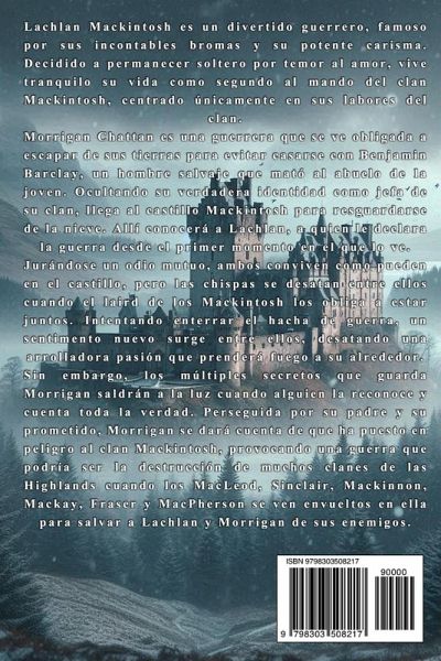Un hombre que huye del compromiso. Una mujer que escapa de su hogar para salvarse. El destino los une, pero ellos se odian... Lachlan Mackintosh es un divertido guerrero, famoso por sus incontables bromas y su potente carisma. Decidido a permanecer soltero por temor al amor, vive tranquilo su vida como segundo al mando del clan Mackintosh, centrado únicamente en sus labores del clan. Morrigan Chattan es una guerrera que se ve obligada a escapar de sus tierras para evitar casarse con Benjamin Barclay, un hombre salvaje que mató al abuelo de la joven. Ocultando su verdadera identidad como jefa de su clan, llega al castillo Mackintosh para resguardarse de la nieve. Allí conocerá a Lachlan, a quien le declara la guerra desde el primer momento en el que lo ve. Jurándose un odio mutuo, ambos conviven como pueden en el castillo, pero las chispas se desatan entre ellos cuando el laird de los Mackintosh los obliga a estar juntos. Intentando enterrar el hacha de guerra, un sentimiento nuevo surge entre ellos, desatando una arrolladora pasión que prenderá fuego a su alrededor. Sin embargo, los múltiples secretos que guarda Morrigan saldrán a la luz cuando alguien la reconoce y cuenta toda la verdad. Perseguida por su padre y su prometido, Morrigan se dará cuenta de que ha puesto en peligro al clan Mackintosh, provocando una guerra que podría ser la destrucción de muchos clanes de las Highlands cuando los MacLeod, Sinclair, Mackinnon, Mackay, Fraser y MacPherson se ven envueltos en ella para salvar a Lachlan y Morrigan de sus enemigos.
