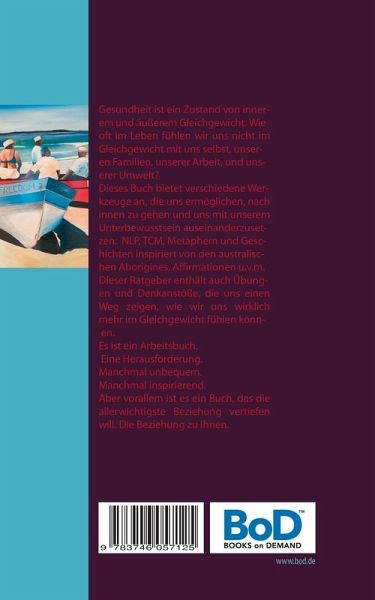 Entdecke die Kraft der Selbstfindung: Mehr Balance, mehr Lebensfreude!< br/>Gesundheit ist ein Zustand des inneren und äußeren Gleichgewichts. Wie oft in unserem Leben fühlen wir uns nicht im Gleichgewicht mit uns selbst, unserer Familie, unserer Arbeit und unserer Umwelt? Dieses Buch bietet verschiedene Werkzeuge an, die es uns ermöglichen, nach innen zu gehen und mit unserem Unterbewusstsein in Kontakt zu treten: NLP, TCM, Metaphern und Geschichten der australischen Ureinwohner, Affirmationen und vieles mehr.Enthalten sind Übungen und Denkanstöße, die uns zeigen, wie wir uns wirklich ausgeglichener fühlen können. Es ist ein Arbeitsbuch. Eine Herausforderung. Manchmal unbequem. Manchmal inspirierend. Aber vor allem ist es ein Buch, das die für jeden Menschen wichtigste Beziehung vertiefen will. Die Beziehung zu sich selbst.