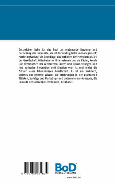 Geschrieben habe ich das Buch als ergänzende Beratung und Darstellung der Leitpunkte, die ich für wichtig halte im Management: Marketing/Verkauf als Grundlage, das Verhalten der Menschen als Teil der Gesellschaft, Mitarbeiter im Unternehmen und als Käufer, Kunde und Verbraucher. Der Verkauf von Gütern und Dienstleistungen und ihre vorherige Produktion und Kreation war, ist und bleibt die Zukunft einer lebensfähigen Gesellschaft. Es ist ein Sachbuch, welches das gelernte Wissen, die Erfahrungen in der praktischen Tätigkeit, Vorträge und Marketing- und Unternehmenskonzepte, die im Laufe der Jahrzehnte entstanden, beinhaltet.