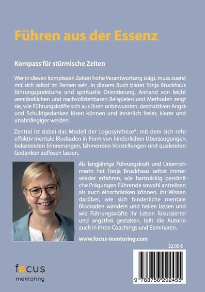 Kompass für authentische Führung in stürmische ZeitenWer in diesen komplexen Zeiten hohe Verantwortung trägt, muss zuerst mit sich selbst im Reinen sein. In diesem Buch bietet Tonja Bruckhaus führungspraktische und spirituelle Orientierung. Anhand von leicht verständlichen und nachvollziehbaren Beispielen und Methoden zeigt sie, wie Führungskräfte sich aus ihren unbewussten, destruktiven Angst- und Schuldgedanken lösen können und innerlich freier, klarer und unabhängiger werden. Zentral ist dabei das Modell der Logosynthese®, mit dem sich sehr effektiv mentale Blockaden in Form von hinderlichen Überzeugungen, belastenden Erinnerungen, lähmenden Vorstellungen und quälenden Gedanken auflösen lassen. Als langjährige Führungskraft und Unternehmerin hat Tonja Bruckhaus selbst immer wieder erfahren, wie hartnäckig persönliche Prägungen Führende sowohl antreiben als auch einschränken können. Ihr Wissen darüber, wie sich hinderliche mentale Blockaden wandeln und heilen lassen und wie Führungskräfte ihr Leben fokussierter und angstfrei gestalten, teilt die Autorin auch in ihren Coachings und Seminaren.