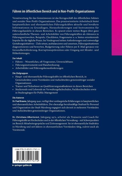 Das Buch ist ein Praxisleitfaden und Arbeitsbuch für Führungskräfte aus öffentlichen Verwaltungen und gemeinnützigen Nonprofit-Organisationen. Führung in Führungsnetzwerken, in denen Führungskräfte und Führungsgremien wesentliche Knoten, aber keine singulären Handlungsträger sind, wird als "unternehmerische" Aufgabe der gesamten Organisationssteuerung verstanden. Im ersten Teil des Buches werden wesentliche erfolgskritische Grundpositionen und Führungswerkzeuge behandelt. Im zweiten Teil wird für die Nutzer der Einstieg über konkrete Handlungssituationen wie Korruptionsprävention oder Umgang mit Demotivation und Führungsversagen eröffnet. Der Wechselbeziehung zwischen ehrenamtlicher und hauptamtlicher Führung wird besondere Aufmerksamkeit geschenkt, weil sie zum Führungsalltag der Zielgruppe gehört. Fallstudien und Checklisten machen den Praxisleitfaden zu einem nützlichen Arbeitsbuch.