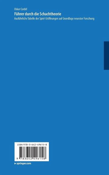 A. Die Königsbauer-Eröffnung (1. e2-e4, e7-e5).- I. Das Königsspringerspiel (2. Sg 1-f3).- Die Spanische Partie oder das Springerspiel des Ruy Lopez (2...,Sb8-c6 3.Lf1-b5).- Die Jtalienische Partie oder das Giuoco piano (2..., Sb8-c6 3.Lf1-c4, Lf8-c5).- Das Evansgambit (2..., Sb8-c6 3. Lf1-c4, Lf8-c5 4. b2-b4).- Das Zweispringerspiel im Nachzuge (2..., Sb8-c6 3. Lf1-c4, Sg8-f6).- Das Drei- und Vierspringerspiel (2...,Sb8-c6 3.Sb1-c3).- Die Schottische Partie (2...,Sb8-c6 3. d2-d4).- Das Englische Springerspiel (2... Sb8-c6 3. c2-c3).- Das Russische Springerspiel oder Springerspiel des Petroff (2..., Sg8-f6).- Das Französische Springerspiel oder Springerspiel des Philidor (2...,d7-d6).- Die unregelmässigen Vertheidigungen des Königsspringerspieles (2..., f7-f6, bez. Dd8-f6, d7-d5, Lf8-d6, Lf8-c5 und f7-f5 [Gambit im Nachzuge]).- II. Das Damenspringerspiel (2. Sb1-c3).- III. Das Läuferspiel (2.Lf1-c4).- IV. Das Königsgambit (2. f2-f4).- Das regelmässige Springergambit (2...,e5×f4 3.Sg1-f3, g7-g54. h2-h4, g5-g4 5. Sf3-e5).- Das Allgaier-Gambit (wie vorhin ... 5. Sf3-g5).- Das Polerio (Muzio-) - Gambit (2..., e5×f4 3. Sg1-f3, g7-g5 4. Lf1-c4, g5-g4).- Das Avalos-Salvio-Gambit (2..., e5×f4 3. Sg1-f3, g7-g5 4. Lf1-c4,g5-g4 5. Sf3-e5).- Das gemeine Springergambit (2..., e5×f4 3. Sg1-f3, g7-g5 4.Lfl-c4, Lf8-g7).- Die unregelmässigen Vertheidigungen im vierten Zuge des Springergambits (2..., e5×f4 3. Sg1-f3, g7-g5 4. Lf1-c4, h7-h6, bez. d7-d6, d7-d5, c7-c6, Dd8-e7 und Lf8-c5).- Die Gambits Rosentreter und Quaade (2..., e5×f4 3. Sg1-f3, g7-g5 4. d2-d4 [Rosentreter], bez. 4. Sbl-c3 [Quaade]).- Die unregelmässigen Vertheidigungen im dritten Zuge des Springergambits (2..., e5×f4 3. Sg1-f3).- Das Läufergambit (2..., e5×f4 3.Lf1-c4).- Unregelmässige Angriffe imKönigsgambit (3. Lf1-e2, bez. Lf1-b5, h2-h4, Ddl-h5, Dd1-f3, Dd1-e2 und Sb1-c3).- Das abgelehnte Königsgambit.- V. Das Mittelgambit (2. d2-d4).- VI. Das Spiel des Damenläuferbauern (2. c2-c3).- B. Die geschlossenen Spiele.- A. Französische Partie (1. e2-e4, e7-e6).- B. Sicilianische Partie (1. e2-e4, c7-c5).- C. Verschiedene unregelmässige Spiele des Königsbauern (1. e2-e4, c7-c6, bez. b7-b6, g7-g6, Sb8-c6, f7-f6 und d7-d5).- D. Spiele des Damenbauern (1. d2-d4, d7-d5, bez. e7-e6, Sg8-f6 und f7-f5 [u. a. Damengambit, Blackmargambit, Holländische Partie u. s. w.]).- E. Spiele der Läuferbauern (1. c2-c4 und 1. f2-f4 [u.a. Fron's Gambit]).- F. Vermischte geschlossene Eröffnungen (1. e2-e3, bez. a2-a3, c2-c3, b2-b4, b2-b3 und Sg1-f3).- Nachträge und Ergänzungen.- Spanische Partie.- Italienische Partie.- Evansgambit.- Drei- und Vierspringerspiel.- Schottische Partie.- Kussisches Springerspiel.- Unregelmässige Verteidigungen des Springerspieles.- Damenspringerspiel.- Läuferspiel.- Regelmässiges Springergambit.- Allgaier-Gambit.- Polerio (Muzio-) - Gambit.- Ayalos-Salvio-Grambit.- Läufergambit.- Abgelehntes Königsgambit.- Mittelgambit.