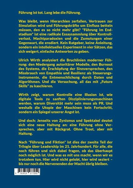 Führung ist tot. Lang lebe die Führung. Was bleibt, wenn Hierarchien zerfallen, Vertrauen zur Simulation wird und Führungskräfte um Einfluss betteln müssen, den es so nicht mehr gibt? Führung im Endstadium. Eine Symphonie des Kontrollverlusts ist der zweite Band einer Trilogie über Leadership im 21. Jahrhundert. Das Buch reflektiert in essayistischer Form, wie klassische Konzepte von Führung angesichts digitaler Kontrollregime, ökonomischer Entgrenzung und gesellschaftlicher Erschöpfung an ihre Grenzen stoßen. Kein Ratgeber, keine Anleitung, sondern ein intellektuelles Experiment in vier Sätzen, das sich weigert, einfache Antworten zu geben. Ulrich Wirth analysiert die Bruchlinien moderner Führung: den Niedergang autoritärer Modelle, den Burnout des Systems, die Erschöpfung der Sinnversprechen, den Missbrauch von Empathie und Resilienz als Steuerungsinstrumente, die Entmenschlichung durch Daten und Algorithmen. Und die Versuchung, all das mit Future Skills zu kaschieren. Dieses Buch zeigt, warum Kontrolle eine Illusion ist, wie digitale Tools zu sanften Disziplinierungsmaschinen werden, warum Diversität mehr sein muss als PR, und weshalb die Utopie der Maschinen kein Fortschritt, sondern ein Spiegel unserer Angst ist. Und doch: Jenseits von Zynismus und Spektakel deutet sich eine neue Haltung an: eine Führung ohne Versprechen, aber mit Haltung. Für alle, die noch führen und sich dabei fragen, ob das überhaupt noch möglich ist. Und was es mit uns macht, wenn wir es trotzdem tun.