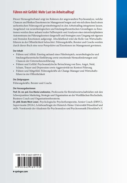 I Führen und Affekt .- "Der Banker des Jahres kann sich Gefühle nicht erlauben!" - ein Filmbeispiel statt einer Einführung.- Vom Affekt zu Gefühl und Mitgefühl - eine neurobiologische und bindungstheoretische Einführung.- Emotionale Herausforderungen und Chancen der Unternehmensführung.- II Führen und Gefühl .- Eros - "Love in the Office".- Angst - Bedingung des Mensch-Seins.- Neid - über die Fallstricke des amerikanischen Traums.- Scham - die Maske der Makellosigkeit.- Trauer und Depression - gelingende und misslingende Bewältigung von Veränderung im Management.- Aggressivität - "Am besten demokratisch und dominant".- III Führen und Mitgefühl .- "Damit Affekte zu Gefühl und Mitgefühl werden" - Führungskräfte als Change Manager.- Wirtschaftsführer in der Öffentlichkeit.