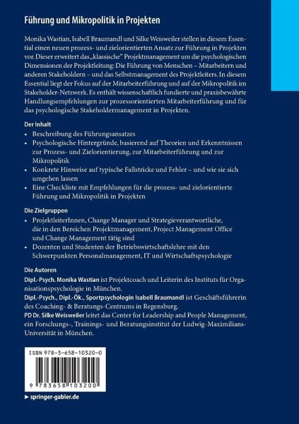 Monika Wastian, Isabell Braumandl und Silke Weisweiler stellen in diesem Essential einen neuen prozess- und zielorientierten Ansatz zur Führung in Projekten vor. Dieser erweitert das "klassische" Projektmanagement um die psychologischen Dimensionen der Projektleitung: Die Führung von Menschen - Mitarbeitern und anderen Stakeholdern - und das Selbstmanagement des Projektleiters. In diesem Essential liegt der Fokus auf der Mitarbeiterführung und auf der Mikropolitik im Stakeholder-Netzwerk. Es enthält wissenschaftlich fundierte und praxisbewährte Handlungsempfehlungen zur prozessorientierten Mitarbeiterführung und für das psychologische Stakeholdermanagement in Projekten.