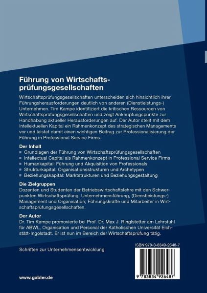 Wirtschaftsprüfungsgesellschaften unterscheiden sich hinsichtlich ihrer Führungsherausforderungen deutlich von anderen (Dienstleistungs-)Unternehmen. Tim Kampe identifiziert die kritischen Ressourcen von Wirtschaftsprüfungsgesellschaften und zeigt Anknüpfungspunkte zur Handhabung aktueller Herausforderungen auf. Der Autor stellt mit dem Intellektuellen Kapital ein Rahmenkonzept des strategischen Managements vor und leistet damit einen wichtigen Beitrag zur Professionalisierung der Führung in Wirtschaftsprüfungsgesellschaften.