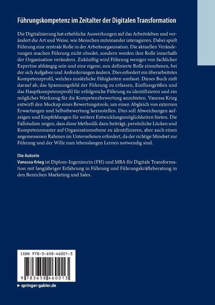 Die Digitalisierung hat erhebliche Auswirkungen auf das Arbeitsleben und verändert die Art und Weise, wie Menschen miteinander interagieren. Dabei spielt Führung eine zentrale Rolle in der Arbeitsorganisation. Die aktuellen Veränderungen machen Führung nicht obsolet, sondern werden ihre Rolle innerhalb der Organisation verändern. Zukünftig wird Führung weniger von fachlicher Expertise abhängig sein und eine eigene, neu definierte Rolle einnehmen, bei der sich Aufgaben und Anforderungen ändern. Dies erfordert ein überarbeitetes Kompetenzprofil, welches zusätzliche Fähigkeiten umfasst. Dieses Buch zielt darauf ab, das Spannungsfeld der Führung zu erfassen, Einflussgrößen und das Hauptkompetenzprofil für erfolgreiche Führung zu identifizieren und ein mögliches Werkzeug für die Kompetenzbewertung anzubieten. Vanessa Krieg entwirft den Mockup eines Bewertungstools, um einen Abgleich von externen Erwartungen und Selbstbewertung herzustellen. Dies soll Abweichungen aufzeigen und Empfehlungen für weitere Entwicklungsmöglichkeiten bieten. Die Fallstudien zeigen, dass diese Methodik dazu beiträgt, persönliche Lücken und Kompetenzmuster auf Organisationsebene zu identifizieren, aber auch einen angemessenen Rahmen im Unternehmen erfordert, da der richtige Mindset zur Führung und der Wille zum lebenslangen Lernen notwendig sind.