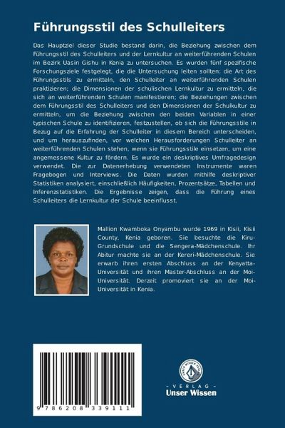 Das Hauptziel dieser Studie bestand darin, die Beziehung zwischen dem Führungsstil des Schulleiters und der Lernkultur an weiterführenden Schulen im Bezirk Uasin Gishu in Kenia zu untersuchen. Es wurden fünf spezifische Forschungsziele festgelegt, die die Untersuchung leiten sollten: die Art des Führungsstils zu ermitteln, den Schulleiter an weiterführenden Schulen praktizieren; die Dimensionen der schulischen Lernkultur zu ermitteln, die sich an weiterführenden Schulen manifestieren; die Beziehungen zwischen dem Führungsstil des Schulleiters und den Dimensionen der Schulkultur zu ermitteln, um die Beziehung zwischen den beiden Variablen in einer typischen Schule zu identifizieren, festzustellen, ob sich die Führungsstile in Bezug auf die Erfahrung der Schulleiter in diesem Bereich unterscheiden, und um herauszufinden, vor welchen Herausforderungen Schulleiter an weiterführenden Schulen stehen, wenn sie Führungsstile einsetzen, um eine angemessene Kultur zu fördern. Es wurde ein deskriptives Umfragedesign verwendet. Die zur Datenerhebung verwendeten Instrumente waren Fragebogen und Interviews. Die Daten wurden mithilfe deskriptiver Statistiken analysiert, einschließlich Häufigkeiten, Prozentsätze, Tabellen und Inferenzstatistiken. Die Ergebnisse zeigen, dass die Führung eines Schulleiters die Lernkultur der Schule beeinflusst.