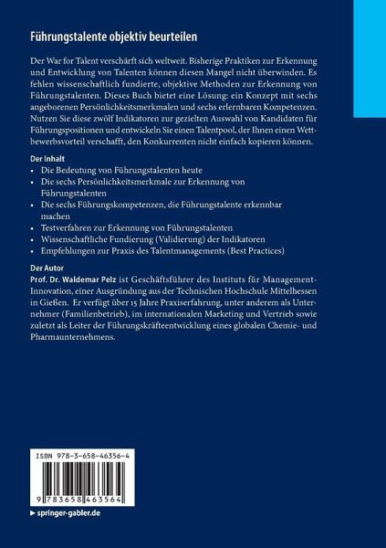 Der War for Talent verschärft sich weltweit. Bisherige Praktiken zur Erkennung und Entwicklung von Talenten können diesen Mangel nicht überwinden. Es fehlen wissenschaftlich fundierte, objektive Methoden zur Erkennung von Führungstalenten. Dieses Buch bietet eine Lösung: ein Konzept mit sechs angeborenen Persönlichkeitsmerkmalen und sechs erlernbaren Kompetenzen. Nutzen Sie diese zwölf Indikatoren zur gezielten Auswahl von Kandidaten für Führungspositionen und entwickeln Sie einen Talentpool, der Ihnen einen Wettbewerbsvorteil verschafft, den Konkurrenten nicht einfach kopieren können.
