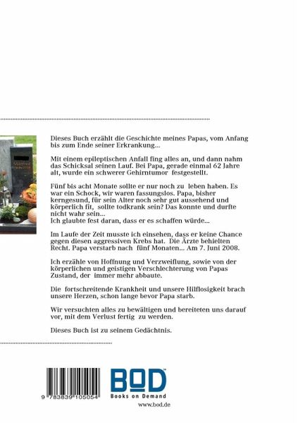 Dieses Buch erzählt die Geschichte meines Papas, vom Anfang bis zum Ende seiner Erkrankung...Mit einem epileptischen Anfall fing alles an, und dann nahm das Schicksal seinen Lauf. Bei Papa, gerade einmal 62 Jahre alt, wurde ein schwerer Gehirntumor festgestellt. Fünf bis acht Monate sollte er nur noch zu leben haben. Es war ein Schock, wir waren fassungslos. Papa, bisher kerngesund, für sein Alter noch sehr gut aussehend und körperlich fit, sollte todkrank sein? Das konnte und durfte nicht wahr sein... Ich glaubte fest daran, dass er es schaffen würde...Im Laufe der Zeit musste ich einsehen, dass er keine Chance gegen diesen aggressiven Krebs hat. Die Ärzte behielten Recht. Papa verstarb nach fünf Monaten... Am 7. Juni 2008.Ich erzähle von Hoffnung und Verzweiflung, sowie von der körperlichen und geistigen Verschlechterung von Papas Zustand, der immer mehr abbaute. Die fortschreitende Krankheit und unsere Hilflosigkeit brach unsere Herzen, schon lange bevor Papa starb Wirversuchten alles zu bewältigen und bereiteten uns darauf vor, mit dem Verlust fertig zu werden.Dieses Buch ist zu seinem Gedächtnis.