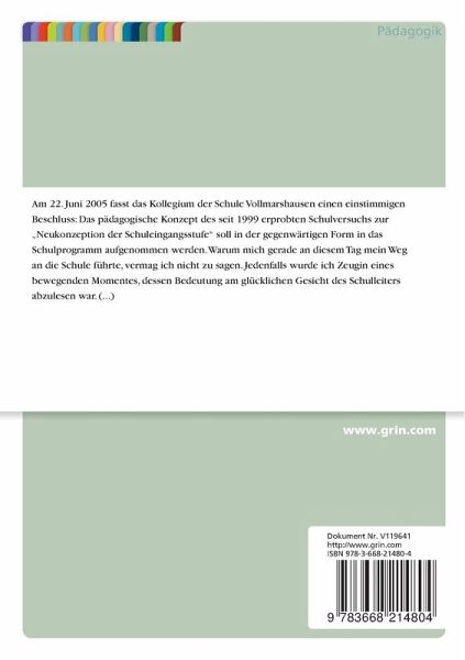 Examensarbeit aus dem Jahr 2005 im Fachbereich Pädagogik - Schulpädagogik, Note: 1,0, Universität Kassel, 17 Quellen im Literaturverzeichnis, Sprache: Deutsch, Abstract: Am 22. Juni 2005 fasst das Kollegium der Schule Vollmarshausen einen einstimmigen Beschluss: Das pädagogische Konzept des seit 1999 erprobten Schulversuchs zur "Neukonzeption der Schuleingangsstufe" soll in der gegenwärtigen Form in das Schulprogramm aufgenommen werden. Warum mich gerade an diesem Tag mein Weg an die Schule führte, vermag ich nicht zu sagen.