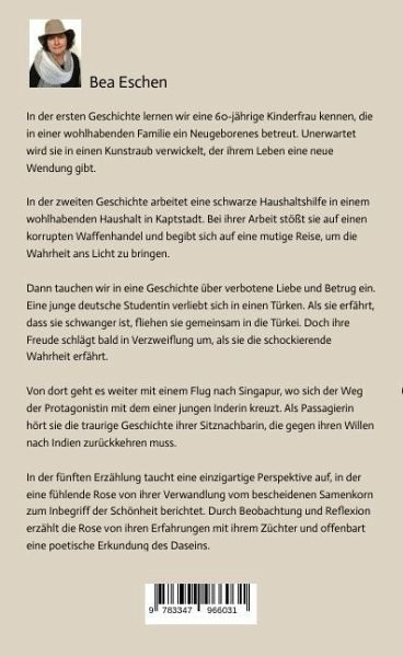 In der Sammlung von fünf Kurzgeschichten entfaltet sich das komplexe Leben faszinierender Charaktere in verschiedenen spannenden Erzählungen.In der ersten Geschichte lernen wir eine 60-jährige Kinderfrau kennen, die in einer wohlhabenden Familie ein Neugeborenes betreut. Unerwartet wird sie in einen Kunstraub verwickelt, der ihrem Leben eine neue Wendung gibt.In der zweiten Geschichte lernen wir eine schwarze Haushaltshilfe kennen, die in Südafrika in einem wohlhabenden Haushalt arbeitet. Bei ihrer Arbeit stößt sie auf einen korrupten Waffenhandel und begibt sich auf eine mutige Reise, um die Wahrheit ans Licht zu bringen.Dann tauchen wir in eine Geschichte über verbotene Liebe und Betrug ein. Eine junge deutsche Studentin verliebt sich in einen Türken. Als sie erfährt, dass sie schwanger ist, fliehen sie gemeinsam in die Türkei. Doch ihre Freude schlägt bald in Verzweiflung um, als sie die schockierende Wahrheit erfährt.Von dort geht es weiter mit einem Flug nach Singapur, wo sich der Weg der Protagonistin mit dem einer jungen Inderin kreuzt. Als Passagierin hört sie die traurige Geschichte ihrer Sitznachbarin, die gegen ihren Willen nach Indien zurückkehren muss.Inmitten dieser fesselnden Geschichten taucht in der fünften Erzählung eine einzigartige Perspektive auf, in der eine fühlende Rose von ihrer Verwandlung vom bescheidenen Samenkorn zum Inbegriff der Schönheit berichtet. Durch Beobachtung und Reflexion erzählt die Rose von ihren Erfahrungen mit ihrem Züchter und offenbart eine poetische Erkundung des Daseins.
