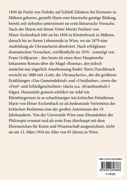 Marie von Ebner-Eschenbach: Fünfhundert Aphorismen Lesefreundlicher Großdruck in 16-pt-Schrift Großformat, 210 x 297 mm Berliner Ausgabe, 2019 Durchgesehener Neusatz bearbeitet und eingerichtet von Theodor Borken Erstdruck 1880. Hier nach der Ausgabe Gesammelte Schriften, Erster Band, Berlin, Verlag von Gebrüder Paetel, 1893. Umschlaggestaltung von Thomas Schultz-Overhage unter Verwendung des Bildes: Marie von Ebner-Eschenbach (Gemälde von Karl Blaas, 1873). Gesetzt aus der Minion Pro, 16 pt. Henricus Edition Deutsche Klassik UG (haftungsbeschränkt) Über die Autorin: 1830 als Freiin von Dubsky auf Schloß Zdislavic bei Kremsier in Mähren geboren, genießt Marie eine klassische geistige Bildung, bereits mit siebzehn unternimmt sie erste literarische Versuche. Nach der Heirat mit ihrem Vetter Moritz Freiherr von Ebner-Eschenbach lebt sie bis 1856 in Klosterbruck in Mähren, danach bis zu ihrem Lebensende in Wien, wo sie 1879 eine Ausbildung als Uhrmacherin absolviert. Nach erfolglosen dramatischen Versuchen, veröffentlicht sie 1876 - ermutigt von Franz Grillparzer - den heute als eines ihrer Hauptwerke bekannten Roman über die Magd »Bozena«, der jedoch zunächst nur zögerlich Anerkennung findet. Ihren Durchbruch erreicht sie 1880 mit »Lotti, die Uhrmacherin«, der die größeren Erzählungen »Das Gemeindekind« und »Unsühnbar«, sowie die »Dorf- und Schloßgeschichten« (darin u.a. »Krambambuli«) folgen. Humanitär gesinnt schildert sie Adel wie Kleinbürgertum in so scharfsinniger wie kritischer Detailtreue. Marie von Ebner-Eschenbach ist als bedeutende Vertreterin des kritischen Realismus eine der großen Autorinnen des 19. Jahrhunderts. Von der Universität Wien zum Ehrendoktor der Philosopie ernannt und als erste Frau überhaupt mit dem Ehrenzeichen für Kunst und Wissenschaft ausgezeichnet, stirbt sie am 12. März 1916 im Alter von 85 Jahren in Wien.