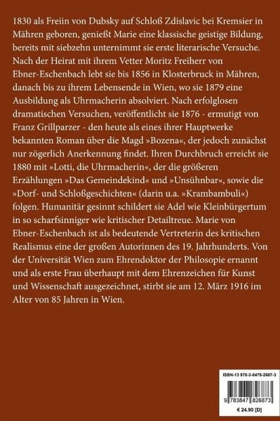 Marie von Ebner-Eschenbach: Fünfhundert Aphorismen Lesefreundlicher Großdruck in 16-pt-Schrift Großformat, 210 x 297 mm Berliner Ausgabe, 2019 Durchgesehener Neusatz bearbeitet und eingerichtet von Theodor Borken Erstdruck 1880. Hier nach der Ausgabe Gesammelte Schriften, Erster Band, Berlin, Verlag von Gebrüder Paetel, 1893. Umschlaggestaltung von Thomas Schultz-Overhage unter Verwendung des Bildes: Marie von Ebner-Eschenbach (Gemälde von Karl Blaas, 1873). Gesetzt aus der Minion Pro, 16 pt. Über die Autorin: 1830 als Freiin von Dubsky auf Schloß Zdislavic bei Kremsier in Mähren geboren, genießt Marie eine klassische geistige Bildung, bereits mit siebzehn unternimmt sie erste literarische Versuche. Nach der Heirat mit ihrem Vetter Moritz Freiherr von Ebner-Eschenbach lebt sie bis 1856 in Klosterbruck in Mähren, danach bis zu ihrem Lebensende in Wien, wo sie 1879 eine Ausbildung als Uhrmacherin absolviert. Nach erfolglosen dramatischen Versuchen, veröffentlicht sie 1876 - ermutigt von Franz Grillparzer - den heute als eines ihrer Hauptwerke bekannten Roman über die Magd »Bozena«, der jedoch zunächst nur zögerlich Anerkennung findet. Ihren Durchbruch erreicht sie 1880 mit »Lotti, die Uhrmacherin«, der die größeren Erzählungen »Das Gemeindekind« und »Unsühnbar«, sowie die »Dorf- und Schloßgeschichten« (darin u.a. »Krambambuli«) folgen. Humanitär gesinnt schildert sie Adel wie Kleinbürgertum in so scharfsinniger wie kritischer Detailtreue. Marie von Ebner-Eschenbach ist als bedeutende Vertreterin des kritischen Realismus eine der großen Autorinnen des 19. Jahrhunderts. Von der Universität Wien zum Ehrendoktor der Philosopie ernannt und als erste Frau überhaupt mit dem Ehrenzeichen für Kunst und Wissenschaft ausgezeichnet, stirbt sie am 12. März 1916 im Alter von 85 Jahren in Wien.
