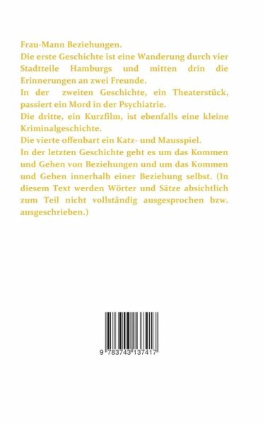 Frau-Mann Beziehungen.Die erste Geschichte ist eine Wanderung durch vier Stadtteile Hamburgs und mitten drin die Erinnerungen an zwei Freunde.In der zweiten Geschichte, ein Theaterstück, passiert ein Mord in der Psychiatrie.Die dritte, ein Kurzfilm, ist ebenfalls eine kleine Kriminalgeschichte.Die vierte offenbart ein Katz- und Mausspiel.In der letzten Geschichte geht es um das Kommen und Gehen von Beziehungen und um das Kommen und Gehen innerhalb einer Beziehung selbst. (In diesem Text werden Wörter und Sätze absichtlich zum Teil nicht vollständig ausgesprochen bzw. ausgeschrieben.)