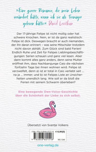 Own-Voice-Autor Vitor Martins schreibt authentisch und einfühlsam über Body Positivity, LGBTQIA+ Themen, Mobbing, Familie, Freundschaft & LiebeDer 17-jährige Felipe ist nicht mollig oder hat schwere Knochen. Nein, er ist da ganz realistisch: Felipe ist dick. Deswegen braucht er auch niemanden, der ihn daran erinnert - was seine Mitschüler trotzdem nicht davon abhält. Zum Glück sind bald Ferien! Endlich Ruhe und Zeit für Felipes Lieblingsbeschäftigungen: Serien schauen und ganz viel lesen. Aber dann kommt alles ganz anders, denn seine Mutter eröffnet ihm, dass Nachbarsjunge Caio die nächsten fünfzehn Tage bei ihnen wohnen wird. Felipe ist verzweifelt, denn a) ist er total in Caio verliebt seit ... na ja ... immer; und b) ist Felipes Liste an Unsicherheiten unendlich lang. Wie soll er da bloß die Ferien mit seinem Schwarm überleben?Ein lockerleicht erzählter Young-Adult-Roman mit tiefgründigen Themen und Setting Brasilien