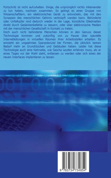 Fortschritt ist nicht aufzuhalten. Dinge, die ursprünglich nichts miteinander zu tun haben, wachsen zusammen. So gelingt es einer Gruppe von Wissenschaftlern, ein elektronisches Gerät zu entwickeln, das mit den Synapsen des menschlichen Gehirns verknüpft werden kann. Behinderte oder Unfallopfer sind dadurch wieder in der Lage, künstliche Gliedmaßen direkt durch Gedankenbefehle zu steuern, oder über elektronische Medien mit der menschlichen Gesellschaft in Kontakt zu treten. Doch auch nicht behinderte Menschen können in den Genuss dieser Technologie kommen und zukünftig von zu Hause über spezielle Internetleitungen in virtuellen Räumen ihrer Arbeitsstellen arbeiten.Es entsteht ein ungeahntes Sparpotenzial bei Firmen, die plötzlich keinen Bedarf mehr an Grundstücken und Gebäuden haben. Leider hat diese Technologie auch eine Kehrseite, wie Sascha Leyden erfahren muss, als er eines Tages vor der Wahl steht, entlassen zu werden oder sich eines der neuen Interfaces implantieren zu lassen.
