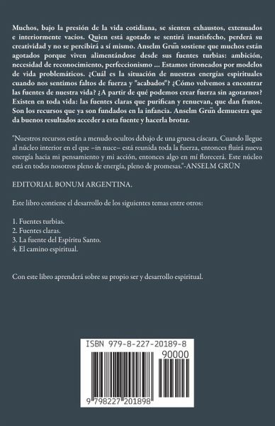 Muchos, bajo la presión de la vida cotidiana, se sienten exhaustos, extenuados e interiormente vacíos. Quien está agotado se sentirá insatisfecho, perderá su creatividad y no se percibirá a sí mismo. Anselm Grün sostiene que muchos están agotados porque viven alimentándose desde sus fuentes turbias: ambición, necesidad de reconocimiento, perfeccionismo ... Estamos tironeados por modelos de vida problemáticos. ¿Cuál es la situación de nuestras energías espirituales cuando nos sentimos faltos de fuerza y "acabados"? ¿Cómo volvemos a encontrar las fuentes de nuestra vida? ¿A partir de qué podemos crear fuerza sin agotarnos? Existen en toda vida: las fuentes claras que purifican y renuevan, que dan frutos. Son los recursos que ya son fundados en la infancia. Anselm Grün demuestra que da buenos resultados acceder a esta fuente y hacerla brotar. "Nuestros recursos están a menudo ocultos debajo de una gruesa cáscara. Cuando llegue al núcleo interior en el que -in nuce- está reunida toda la fuerza, entonces ¿uirá nueva energía hacia mi pensamiento y mi acción, entonces algo en mí ¿orecerá. Este núcleo está en todos nosotros pleno de energía, pleno de promesas."-ANSELM GRÜN EDITORIAL BONUM ARGENTINA. Este libro contiene el desarrollo de los siguientes temas entre otros: 1. Fuentes turbias. 2. Fuentes claras. 3. La fuente del Espíritu Santo. 4. El camino espiritual. Con este libro aprenderá sobre su propio ser y desarrollo espiritual. ¡Descargue ya este libro y comience a aprender sobre el maravilloso mundo! Tags: camino espiritual, crecimiento espiritual, consejos bíblicos, espiritualidad, sanacion espiritual, anselm grun, fuerza interior.