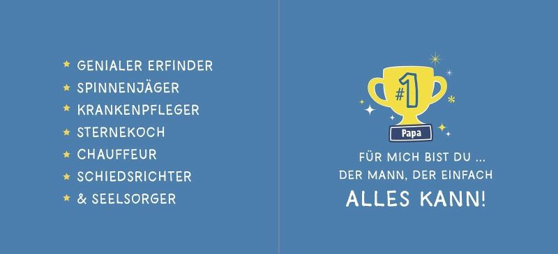 Mit zeitlosen Fotos und kreativer grafischer Gestaltung entlockt dieses Geschenkbuch garantiert auch deinem Papa ein Lächeln. Dieses Mini-Buch ist die perfekte Möglichkeit, ihm zu zeigen, wie sehr er jeden Tag geschätzt wird. Nicht nur der Vatertag kann ein besonderer Anlass für dieses Geschenk sein - Geburtstage, Feiertage oder "einfach so" - es gibt immer einen gutenGrund, dem Papa "Danke" zu sagen.