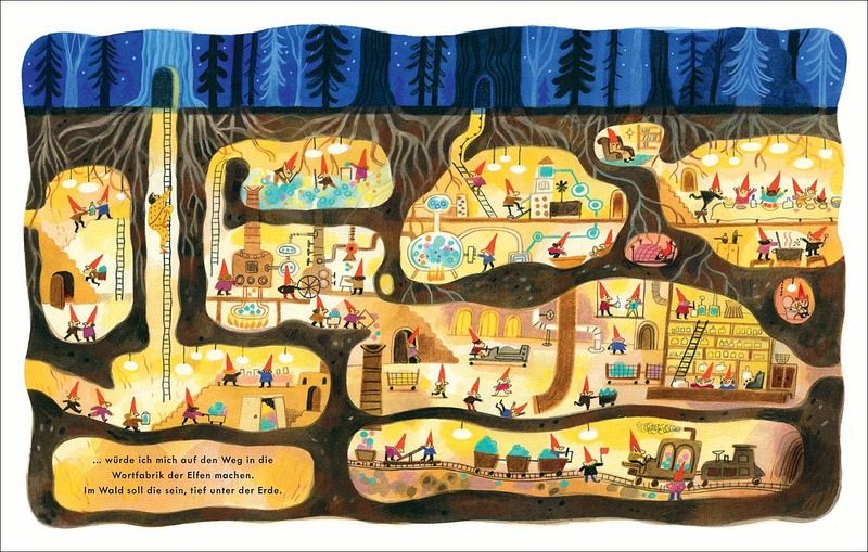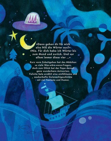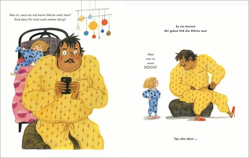»Den ganzen Tag hat Papa so viel gesprochen, kann es da nicht sein, dass ihm irgendwann die Wörter ausgehen und er für mich gar keine mehr übrig hat?« Diese Frage beschäftigt das Mädchen kurz vorm Zubettgehen. Und ohne eine Antwort ihres Papas kann sie natürlich nicht einschlafen. Also versucht der Papa ihr die Sorgen zu nehmen - doch die Was-wäre-wenn-Fragen sprudeln nur so aus dem Mädchen heraus. Zum Glück findet er die passenden Antworten: Wenn ihm jemals die Wörter ausgehen sollten, dann würde er sich in der Wortfabrik der Elfen neue Wörter holen. Auch wenn das bedeutet, dass er durch düstere Wälder laufen, vor Piraten fliehen oder mit einer Rakete wieder nach Hause fliegen muss - denn für seine Tochter ist ihm kein Weg zu weit.