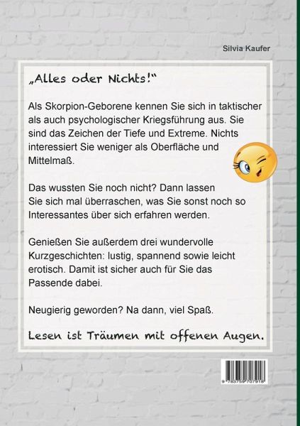 Bezaubernde Sternzeichen-Analyse für den weiblichen SkorpionWelche Frau interessiert es nicht, was für ein Geheimnis hinter ihrem Sternzeichen steckt. Es sei dahingestellt, ob sie daran glaubt oder nicht. Interessant ist so eine persönliche Analyse allemal.In einem sehr unterhaltsamen astrologischen Part erfährt die Leserin etwas über sich, was sie bisher vielleicht noch nicht wusste. Das könnte das fehlende Puzzleteil zur Selbsterkenntnis sein. Durch eine persönliche Ansprache im Text bekommt sie das Gefühl mittendrin zu sein.Bei einem lustigen Kreuzworträtsel kann sie dann noch zeigen, was sie astrologisch so alles drauf hat.Ein weiteres Highlight sind die drei wundervollen Kurzgeschichten - spannend, lustig sowie leicht erotisch.1. Die Frau, die aus dem Schatten kam.Ein mystischer Roman, der das familiäre Geheimnis lüftet, warum eine erfolgreiche Frau, die alles hat, nicht glücklich ist und sich stets in einem innerlichen Zwiespalt befindet.2. Erdbeerpralinen zum Frühstück.In dieser romantisch erotischen Geschichte macht eine kesse selbstbewusste Frau die Erfahrung, dass die Liebe ihre ganz eigenen Regeln hat.3. Riskante Flucht in die Zukunft.Hier stehen Spannung, Gefühl und Toleranz an erster Stelle. Ein Roman, der die aktuelle weltliche Situation sehr schön widerspiegelt.