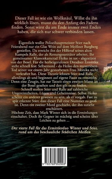 Dieser Fall ist wie ein Wollknäul. Willst du ihn wirklich lösen, musst du den Anfang des Fadens finden. Sonst wirst du am Ende immer zwei Enden haben, die sich nur schwer verbinden lassen. Eigentlich wollte Polizeihauptmeister Stier nach Feierabend nur ein Glas Wein auf dem Meißner Burgberg genießen. Da erreicht ihn der Hilferuf seines alten Kumpels Ralle, der als Rettungssanitäter arbeitet. Ihr gemeinsamer Klassenkamerad Heiko ist tot - abgestürzt von der Bosel. Für die herbeigerufenen Dresdner Ermittler steht schnell fest: Selbstmord - da Heiko den mysteriösen Tod seiner vor einem Jahr gestorbenen Frau Monika nicht verkraftet hat. Diese Theorie lehnen Stier und Ralle allerdings ab und beginnen auf eigene Faust zu ermitteln. Denn eine Zeugin, hat zur Tatzeit einen zweiten Mann an der Bosel gesehen und den gilt es zu finden. Schnell stoßen Stier und Ralle auf zahlreiche Ungereimtheiten, Lügen und Geheimnisse. Selbst Heiko scheint ein anderer gewesen zu sein, als er vorgab. Fast zu spät erkennt Stier, dass dieser Fall eine Nummer zu groß ist. Denn ein zweiter Mord geschieht, der ihn zutiefst erschüttert. Höchste Zeit, dass Mark Winter sich in die Ermittlungen einschaltet. Doch ihr Gegner ist mächtig und scheint über Leichen zu gehen ... Der vierte Fall für das Ermittlerduo Winter und Stier, rund um das beschauliche Städtchen Meißen.