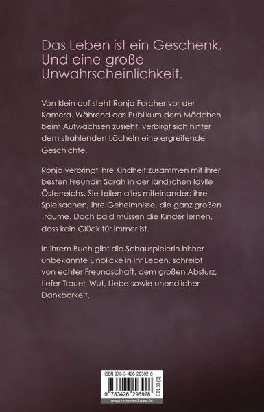 Ronja Forcher spricht das erste Mal über einen prägenden Teil ihrer Kindheit, die sie in einem idyllischen Tal zwischen Wiesen und Bergen verbringt, zusammen mit ihrer besten Freundin Sarah. Sie teilen alles miteinander: ihre Spielsachen, ihre Geheimnisse, die ganz großen Träume. Doch Sarah leidet an einer seltenen Erkrankung, die sie wie im Zeitraffertempo altern lässt. Und die beiden Mädchen müssen früh lernen, dass kein Glück für immer ist.