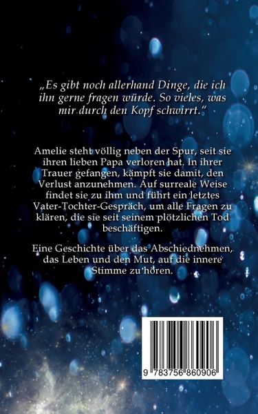 "Es gibt noch allerhand Dinge, die ich ihn gerne fragen würde. So vieles, was mir durch den Kopf schwirrt."Amelie steht völlig neben der Spur, seit sie ihren lieben Papa verloren hat. In ihrer Trauer gefangen, kämpft sie damit, den Verlust anzunehmen. Auf surreale Weise findet sie zu ihm und führt ein letztes Vater-Tochter-Gespräch, um alle Fragen zu klären, die sie seit seinem plötzlichen Tod beschäftigen. Eine Geschichte über das Abschiednehmen, das Leben und den Mut, auf die innere Stimme zu hören.