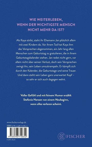 Als Kaya stirbt, steht ihr Ehemann Jan plötzlich allein mit zwei Kindern da. Vor ihrem Tod hat Kaya ihm das Versprechen abgenommen, ein Jahr lang allen Menschen zum Geburtstag zu gratulieren, die in ihrem Geburtstagskalender stehen. Jan redet nicht gern, vor allem nicht über seinen Verlust. Doch sein Versprechen zwingt ihn, sein Leben umzukrempeln. Er kämpft sich durch den Kalender, die Geburtstage und seine Trauer. Und dann steht sein Leben ganz unerwartet Kopf - so sehr er sich auch dagegen wehrt.