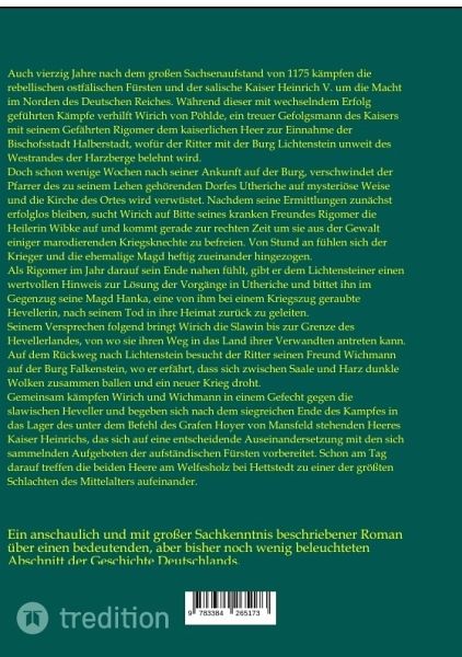Auch vierzig Jahre nach dem großen Sachsenaufstand von 1175 kämpfen die rebellischen ostfälischen Fürsten und der salische Kaiser Heinrich V. um die Macht im Norden des Deutschen Reiches. Während dieser mit wechselndem Erfolg geführten Kämpfe verhilft Wirich von Pöhlde, ein treuer Gefolgsmann des Kaisers mit seinem Gefährten Rigomer dem kaiserlichen Heer zur Einnahme der Bischofsstadt Halberstadt, wofür der Ritter mit der Burg Lichtenstein unweit des Westrandes der Harzberge belehnt wird.Doch schon wenige Wochen nach seiner Ankunft auf der Burg, verschwindet der Pfarrer des zu seinem Lehen gehörenden Dorfes Utheriche auf mysteriöse Weise und die Kirche des Ortes wird verwüstet. Nachdem seine Ermittlungen zunächst erfolglos bleiben, sucht Wirich auf Bitte seines kranken Freundes Rigomer die Heilerin Wibke auf und kommt gerade zur rechten Zeit um sie aus der Gewalt einiger marodierenden Kriegsknechte zu befreien. Von Stund an fühlen sich der Krieger und die ehemalige Magd heftig zueinander hingezogen. Bei einem Besuch des Ritters seinen Freund Wichmann auf der Burg Falkenstein, wo er erfährt, dass sich zwischen Saale und Harz dunkle Wolken zusammen ballen und ein neuer Krieg droht. Gemeinsam kämpfen Wirich und Wichmann in einem Gefecht gegen die slawischen Heveller und begeben sich nach dem siegreichen Ende des Kampfes in das Lager des unter dem Befehl des Grafen Hoyer von Mansfeld stehenden Heeres Kaiser Heinrichs, das sich auf eine entscheidende Auseinandersetzung mit den sich sammelnden Aufgeboten der aufständischen Fürsten vorbereitet. Schon am Tag darauf treffen die beiden Heere am Welfesholz bei Hettstedt zu einer der größten Schlachten des Mittelalters aufeinander.