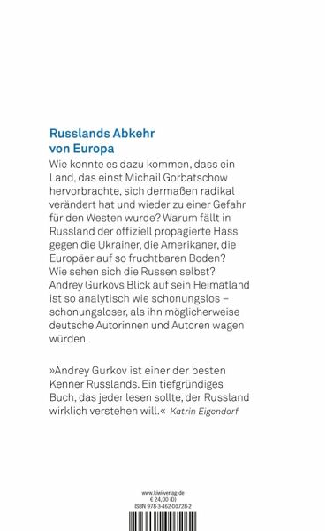 Der gebürtige Moskauer und in Köln lebende russische Journalist Andrey Gurkov geht in seinem Buch den historischen, kulturellen, politischen und massenpsychologischen Gründen für dieses Phänomen auf den Grund. Zugleich warnt er eindringlich vor der illusorischen Erwartung, es könne nach einem Ende des Ukrainekriegs eine Wiederherstellung früherer Beziehungen Deutschlands bzw. Europas zu Russland geben - die russische Gesellschaft sieht sich längst nicht mehr als Teil der europäischen Wertegemeinschaft, Europa ist zum Feindbild geworden.