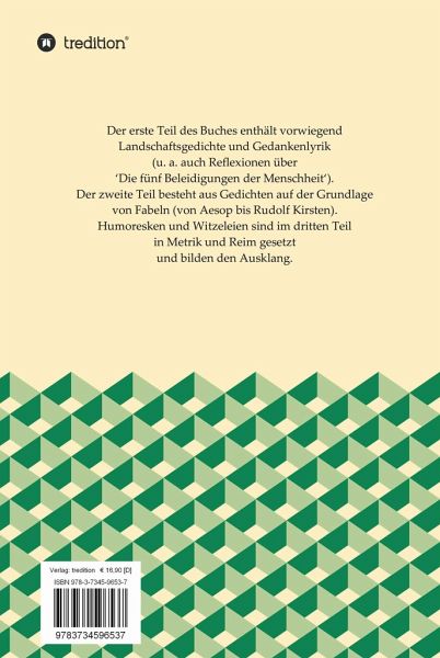 Der erste Teil des Buches enthält vorwiegend Landschaftsgedichte und Gedankenlyrik (u. a. auch Reflexionen über 'Die fünf Beleidigungen der Menschheit'). Der zweite Teil besteht aus Gedichten auf der Grundlage von Fabeln (von Aesop bis Rudolf Kirsten). Humoresken und Witzeleien sind im dritten Teil in Metrik und Reim gesetzt und bilden den Ausklang.
