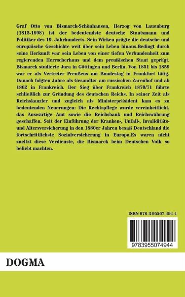 Graf Otto von Bismarck-Schönhausen, Herzog von Lauenburg (1815-1898) ist der bedeutendste deutsche Staatsmann und Politiker des 19. Jahrhunderts. Sein Wirken prägte die deutsche und europäische Geschichte weit über sein Leben hinaus.Bedingt durch seine Herkunft war sein Leben von einer tiefen Verbundenheit zum regierenden Herrscherhaus und dem preußischen Staat geprägt. Bismarck studierte Jura in Göttingen und Berlin. Von 1851 bis 1859 war er als Vertreter Preußens am Bundestag in Frankfurt tätig. Danach folgten Jahre als Gesandter am russischen Zarenhof und ab 1862 in Frankreich. Der Sieg über Frankreich 1870/71 führte schließlich zur Gründung des deutschen Reichs. In seiner Zeit als Reichskanzler und zugleich als Ministerpräsident kam es zu bedeutenden Neuerungen: Die Rechtspflege wurde vereinheitlicht, das Auswärtige Amt sowie die Reichsbank und Reichswährung geschaffen. Seit der Einführung der Kranken-, Unfall-, Invaliditäts- und Altersversicherung in den 1880er Jahren besaß Deutschland die fortschrittlichste Sozialversicherung in Europa.Es waren nicht zueltzt diese Verdienste, die Bismarck beim Deutschen Volk so beliebt machten.