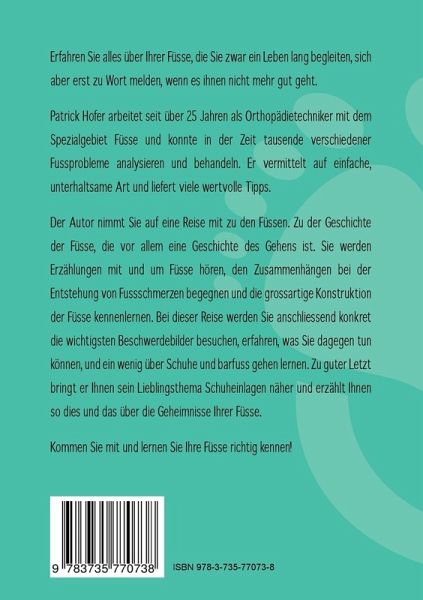 Erfahren Sie alles über Ihrer Füsse, die Sie zwar ein Leben lang begleiten, sich aber erst zu Wort melden, wenn es ihnen nicht mehr gut geht. Patrick Hofer arbeitet seit über 25 Jahren als Orthopädietechniker mit dem Spezialgebiet Füsse und konnte in der Zeit tausende verschiedener Fussprobleme analysieren und behandeln. Er vermittelt auf einfache, unterhaltsame Art und liefert viele wertvolle Tipps.Der Autor nimmt Sie auf eine Reise mit zu den Füssen. Zu der Geschichte der Füsse, die vor allem eine Geschichte des Gehens ist. Sie werden Erzählungen mit und um Füsse hören, den Zusammenhängen bei der Entstehung von Fussschmerzen begegnen und die grossartige Konstruktion der Füsse kennenlernen. Bei dieser Reise werden Sie anschliessend konkret die wichtigsten Beschwerdebilder besuchen, erfahren, was Sie dagegen tun können, und ein wenig über Schuhe und barfuss gehen lernen. Zu guter Letzt bringt er Ihnen sein Lieblingsthema Schuheinlagen näher und erzählt Ihnen so dies und das über die Geheimnisse Ihrer Füsse.Kommen Sie mit und lernen Sie Ihre Füsse richtig kennen!
