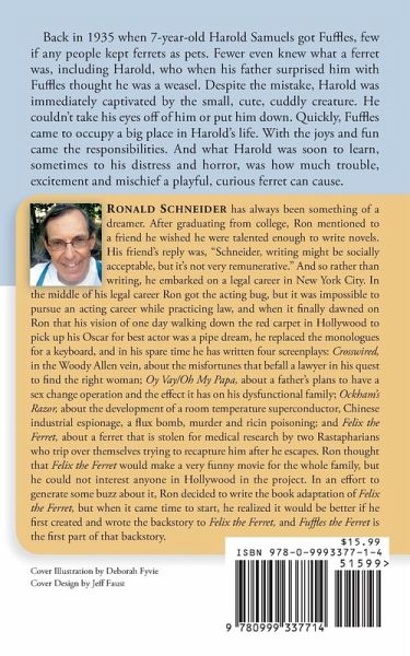 Ronald Schneider has always been something of a dreamer. After graduating from college, Ron mentioned to a friend he wished he were talented enough to write novels. His friend's reply was, "Schneider, writing might be socially acceptable, but it's not very remunerative." And so rather than writing, he embarked on a legal career in New York City. In the middle of his legal career Ron got the acting bug, but it was impossible to pursue an acting career while practicing law, and when it finally dawned on Ron that his vision of one day walking down the red carpet in Hollywood to pick up his Oscar for best actor was a pipe dream, he replaced the monologues for a keyboard, and in his spare time he has written four screenplays: Crosswired, in the Woody Allen vein, about the misfortunes that befall a lawyer in his quest to find the right woman; Oy Vay/Oh My Papa, about a father's plans to have a sex change operation and the effect it has on his dysfunctional family; Ockham's Razor, about the development of a room temperature superconductor, Chinese industrial espionage, a flux bomb, murder and ricin poisoning; and Felix the Ferret, about a ferret that is stolen for medical research by two Rastapharians who trip over themselves trying to recapture him after he escapes. Ron thought that Felix the Ferret would make a very funny movie for the whole family, but he could not interest anyone in Hollywood in the project. In an effort to generate some buzz about it, Ron decided to write the book adaptation of Felix the Ferret, but when it came time to getting started, he realized it would be better if he first created and wrote the backstory to Felix the Ferret, and Fuffles the Ferret is the first part of that backstory.